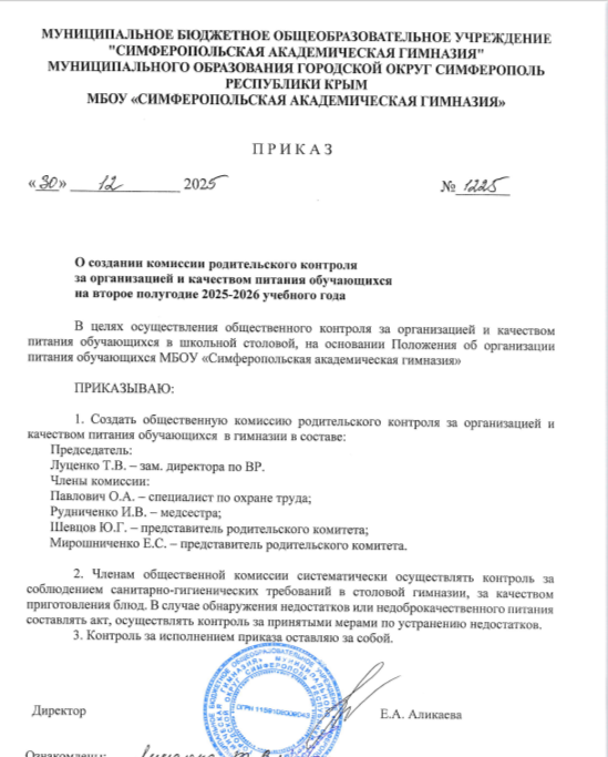 27.01.2026 года, с целью обеспечения эффективного контроля за качеством горячего питания родительский контроль посетил пищеблок Симферопольской академической гимназии. Оценили качество продуктов, условия их хранения, санитарное состояние помещений.